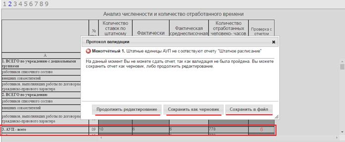 После заполнения отчета нажмите на кнопку «Сдать отчет» и только после этого переходите к заполнению следующего отчета. В программе предусмотрены контроли различного уровня, как арифметические, так и контроли заполнения показателей различными типами учреждений. В случае если контроли не выполнены, при сдаче отчета программа сообщит вам об этом, выведя на экран «Протокол валидации», в котором указан перечень ошибок, которые были допущены при заполнении отчета или укажет на необходимость заполнить «Фиксированные показатели» в случае если они не заполнены. Необходимо ознакомиться с перечнем ошибок, который приведен в «Протоколе валидации», для удобства весь перечень ошибок можно выгрузить в файл, нажав кнопку «Сохранить в файл». После этого продолжить редактирование отчета, нажав на кнопку «Продолжить редактирование». Если же вам необходимо выйти из отчета, допустим для заполнения «Фиксированных показателей», нажмите кнопку «Сохранить как черновик» для сохранения всех введенных данных в отчете.