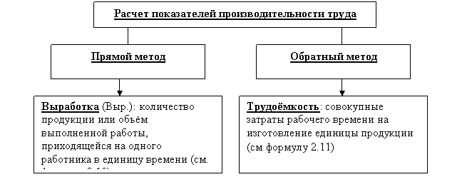 Эффективность затрат труда работников в процессе производства определяется производительностью (плодотворностью) труда. На рис. 2.16 приведены методы расчета показателей производительности труда.