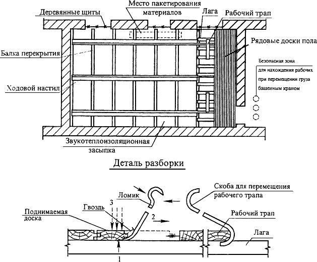 Рабочие трапы укладываются непосредственно на три смежные лаги и по мере разборки досок пола перемещаются по лагам к очередной разбираемой доске с помощью металлической скобы из арматурной стали A-I