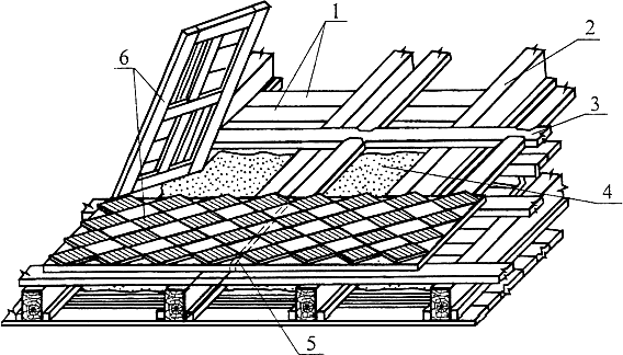 1 - подбор; 2 - балка перекрытия с черепными брусками; 3 - обрешетка из досок по балкам; 4 - засыпка; 5 - перепил по квадратам заклейки; 6 - паркетные щиты