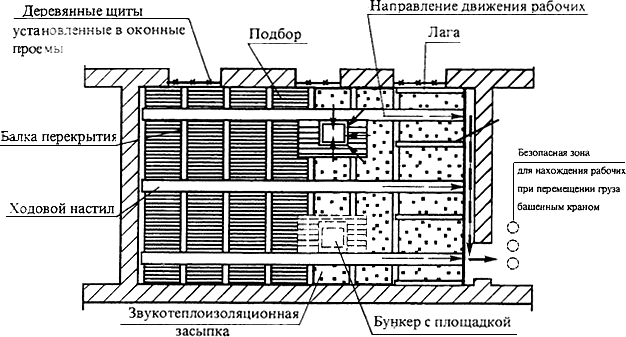 2.9 Перед удалением засыпки (смазки) ее разрыхляют с помощью пневматического отбойного молотка или ломика, при сухой ветреной погоде по необходимости смачивают. Разрыхленную засыпку (смазку) удаляют совковыми лопатами в ящики, установленные на деревянных щитах, или контейнеры, которые устанавливают на подкладки из досок не далее 1,5-2 м от опор балок. Загруженные ящики или контейнеры транспортируются башенным краном в приемный объектовый бункер-мусоросборник (отвал) или непосредственно в автотранспорт. Щит под ящик-мусоросборник укладывается на две смежные балки перекрытия на расстоянии не более 1,5 м от их заделки в кирпичную стену и переставляется на смежные участки перекрытия по мере удаления засыпки с предыдущих участков. Работы выполняются с ходовых настилов, выполненных в период разборки полов. В целях максимального использования башенного крана по транспортировке засыпки с перекрытия на объектовый склад необходимо устанавливать несколько бункеров под загрузку засыпкой (определяется ППР, исходя из фактических объемов работ), как показано на рисунке 5. Для удаления строительногомусора допускается использование и мусоропроводов.