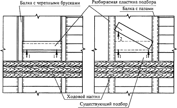 2.10 Подбор снимают при помощи специального ломика с ходовых настилов и укладывают в пакеты на прокладки, уложенные на балки перекрытия. При наличии балок с пазами доски подбора разбирают, поворачивая в горизонтальной плоскости перекрытия до полного выхода его концов из пазов балок. Снятые подборы укладывают в штабель и удаляют с помощью башенного крана. Схема разборки подбора приведена на рисунке 6.