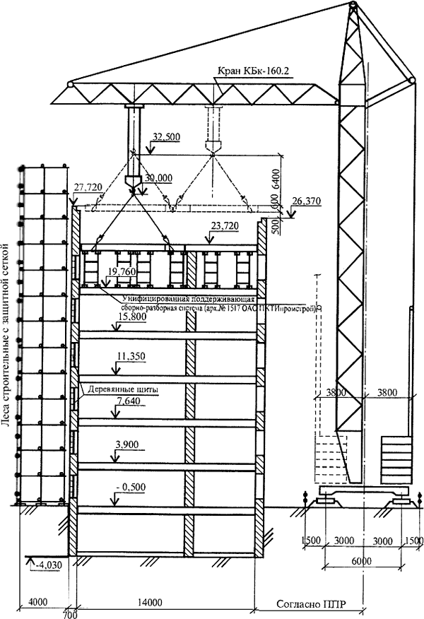 Выход рабочих в безопасную зону при перемещении башенным краном пакета с подшивкой и возвращение обратно на рабочее место выполняется по сигналу стропальщика по ходовым настилам.