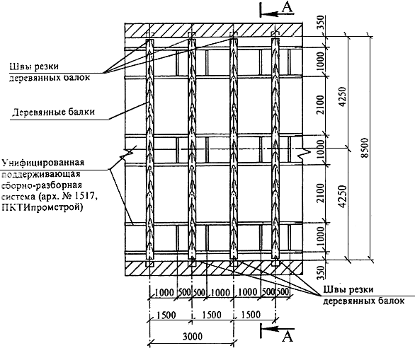 - балка подпирается в трех местах со стороны опор (у стен) и в середине ее пролета инвентарной переставной сборно-разборной поддерживающей системой или телескопическими стойками;