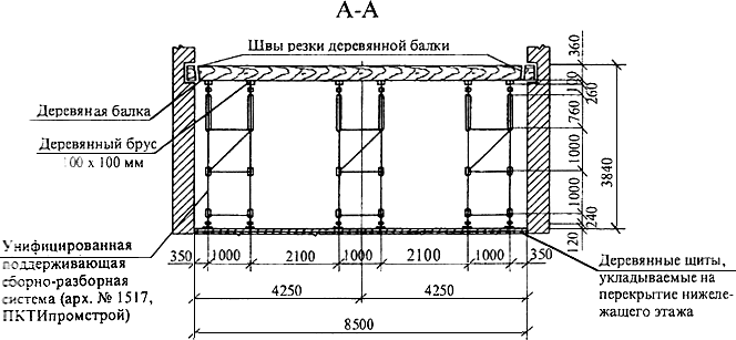 Все операции по разборке балок производят с временного настила из двух-трех досок, которые опирают на соседние балки. Последние две-три балки на захватке разбирают с временных подмостей, устанавливаемых (после удаления подшивки потолка) на нижележащем перекрытии.