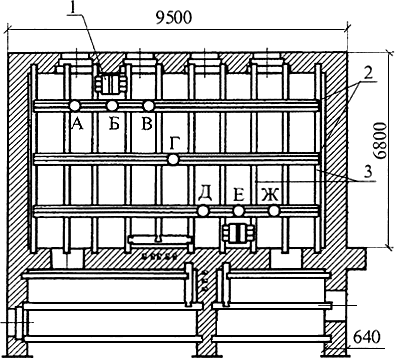 1 - контейнер; 2 - временный настил; 3 - балки перекрытия; А, Б, Д, Е - рабочие места плотников; В, Ж - рабочие места подсобных рабочих; Г - рабочее место такелажника