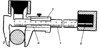 Штангенциркуль (рис.1,а, б) Состоит из подвижной и неподвижной измерительных губок 2, 3 и имеет две шкалы: (см. рис. 2,а): основная 1 и шкала 4 нониуса. Цена деления основной шкалы - 1мм, нониуса – 0,9 мм (см. рис. 2,б), таким образом, каждое деление нониуса короче деления штанги на 0,1 мм. точностью нониуса называется отношение цены деления шкалы основной линейки к числу делений нониуса. Чтобы измерить линейный размер предмета, его зажимают между измерительными губками штангенциркуля и делают отсчет по нониусу. Если нулевое деление нониуса совпадает с каким-нибудь делением шкалы (на штанге), то это деление указывает действительный размер в мм. Если нулевое деление нониуса не совпадает ни с одним делением основной шкалы,