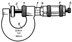 Микрометр (рис. 2, а, б) представляет собой массивную металлическую скобу 8, с одной стороны которой имеется неподвижная измерительная пятка, с другой – стебель 2, снаружи охватываемый барабаном 4, соединенный с микрометрическим винтом 7. На правом конце стебля микрометра имеется трещотка, предназначенная дляобеспечения постоянства измерительного усилия. На поверхность стебля микрометра нанесена продольная риска, вдоль которой (выше и ниже ее) нанесены миллиметровые штрихи 3.