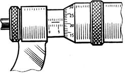 Показания микрометра складываются из показаний основной шкалы и шкалы барабана (см. рис. 3 б). Порядковый номер видимого нижнего штриха основной шкалы перед кромкой барабана равен целому числу миллиметров. Если перед кромкой барабана виден еще и штрих сверху, то к числу миллиметров нужно прибавить еще 0,5 мм. Число сотых долей миллиметра равно порядковому номеру штриха на шкале барабана, совпадающего с продольным штрихом шкалы.