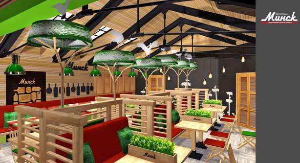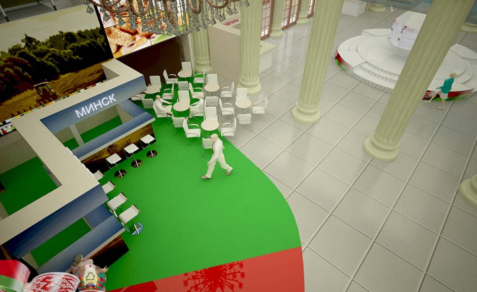 Работа ресторана белорусской кухни будет организована в помещениях выставочного зала исторической части павильона на первом этаже, а также в антресольной его части. Общая площадь ресторана белорусской кухни составит порядка 140 м2. Общее решение ресторана, интерьер будут отражать национальную культуру, ее колорит и самобытность, а также органично вписываться в концепцию всего павильона.