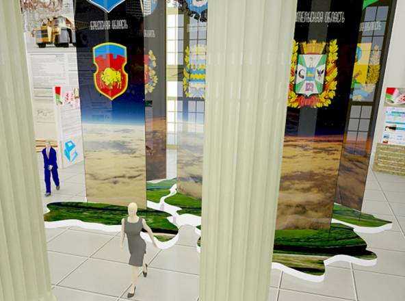 За межколонным пространством размещена карта Беларуси, разделенная на области. Над каждой областью «парят» полотна, на которые нанесены гербы областей и областных центров. Карта и парящие полотна также играют роль элемента художественного оформления павильона.