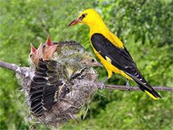 Чуть позже трясогузок и горихвосток к нам прилетают иволги. Самец иволги - один из самых привлекательных певцов городских парков. Его оперение отличается ярко-желтой окраской, благодаря которой перепутать эту птицу с кем-либо еще невозможно. Самка окрашена гораздо скромнее. Кроме характерной внешности, иволгу легко узнать по голосу - мелодичному свисту, напоминающему звуки флейты. Голос иволги знаком каждому жителю нашего города. Эту трель издают и самцы, и самки, по-видимому, обозначая с ее помощью границу своих гнездовых угодий. С этим же свистом они нападают на соперников. Во время тревоги у гнезда птицы издают громкий, неприятный скрипуче-мяукающий короткий звук.