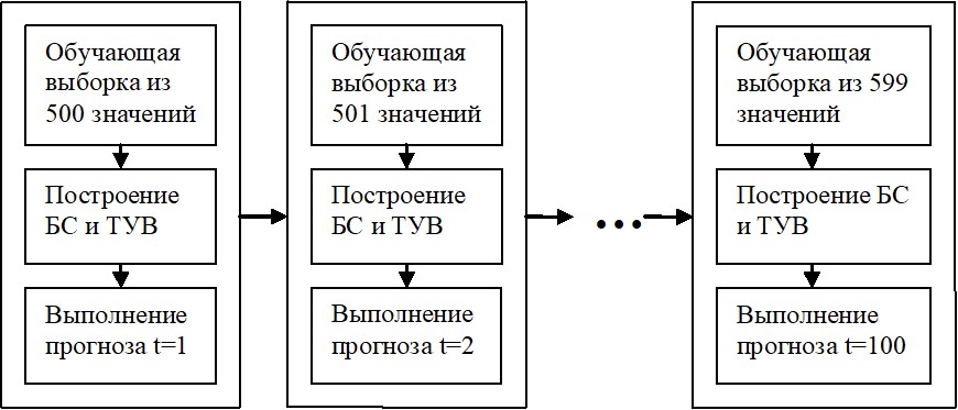 Решение задачи. На рис. 1 представлена структурная схема динамического прогнозирования композитного индекса с помощью БС. При построении БС использовался эвристический метод построения БС [1]. Для построения таблиц условных вероятностей (ТУВ) используется классический алгоритм вычисления вероятностей [2].