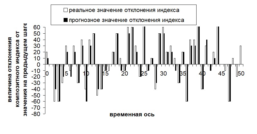 Рис. 3 Диаграмма изменения прогнозного и реального отклонений композитного индекса на 50 временных интервалах