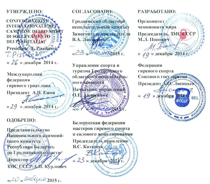 CONFEDERAZIONE INTERNAZIONALE DEI CAMPIONE DELLO SPORT DI SOLLEVAMENTO DEI PESI (ITALIA) Presidente T. Pissikemi « » декабря 2014 г. Международная федерация гиревого триатлона Президент « » декабря 2014 г. ОДОБРЕНО: Представительство Национального олимпийского комитета Республики Беларусь Директор ЗМС СССР « » 2015 г. | Гродненский областной исполнительный комитет Заместитель председателя « » 2015 г. Управление спорта и туризма Гродненского областного исполнительного комитета Начальник управления « » 2015 г. Белорусская федерация мастеров гиревого спорта и силового жонглирования Председатель правления « » декабря 2014 г. | Оргкомитет Председатель, ЗМС СССР « » декабря 2014 г. Федерация гиревого спорта Союзного государства Президент « » декабря 2014 г. |