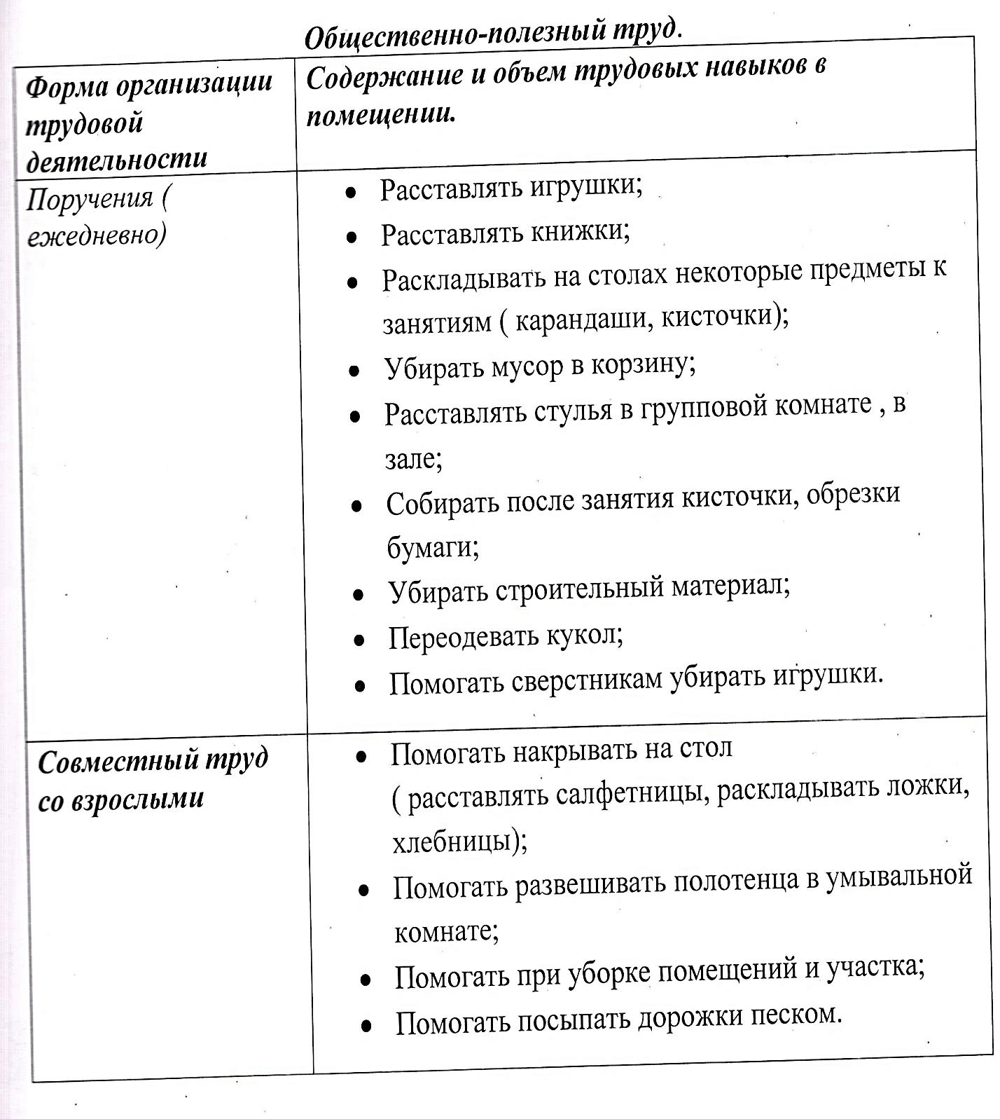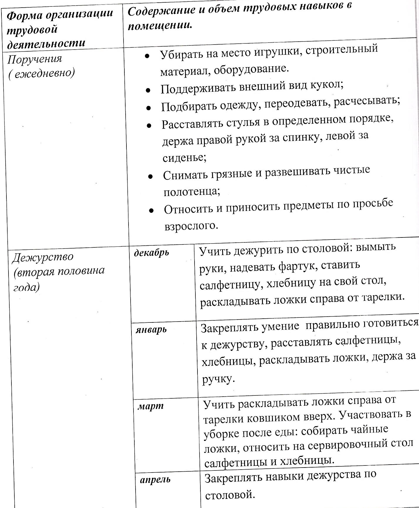- Воспитывать у детей положительное отношение к труду, желание трудиться. Формировать ответственное отношение к порученному заданию (умение и желание доводить дело до конца, стремление сделать его хорошо). Воспитывать умение выполнять индивидуальные и коллективные поручения, понимать значение результатов своего труда для других; формировать умение договариваться с помощью воспитателя о распределении коллективной работы, заботиться о своевременном завершении совместного задания. Поощрять инициативу в оказании помощи товарищам, взрослым. Приучать детей самостоятельно поддерживать порядок в групповой комнате и на участке детского сада: убирать на место строительный материал, игрушки; помогать воспитателю подклеивать книги, коробки. Учить детей самостоятельно выполнять обязанности дежурных по столовой: аккуратно расставлять хлебницы, чашки с блюдцами, глубокие тарелки, ставить салфетницы, раскладывать столовые приборы (ложки, вилки). Закреплять лексические темы, развивать пассивный и активный словарь детей.