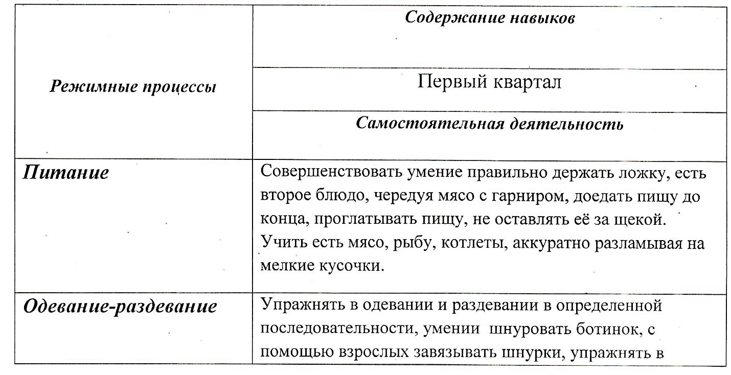 - Формировать у детей привычку следить за чистотой тела, опрятностью одежды, прически; самостоятельно чистить зубы, умываться, по мере необходимости мыть руки, следить за чистотой ногтей; при кашле и чихании закрывать рот и нос платком. Закреплять умение замечать и самостоятельно устранять непорядок в своем внешнем виде. Совершенствовать культуру еды: умение правильно пользоваться столовыми приборами (вилкой, ножом); есть аккуратно, бесшумно, сохраняя правильную осанку за столом; обращаться с просьбой, благодарить. Закреплять лексические темы, развивать пассивный и активный словарь детей.