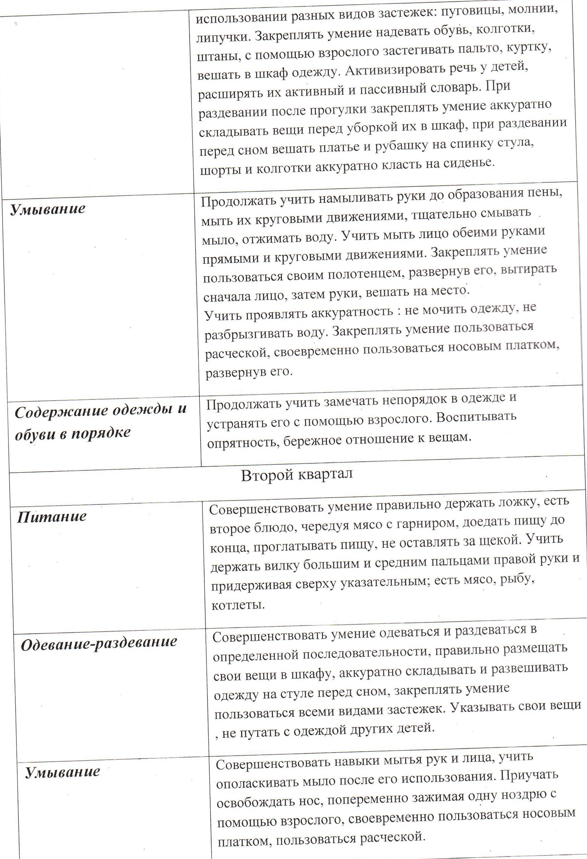 - Совершенствовать культурно-гигиенические навыки, формировать простейшие навыки поведения во время еды, умывания. Приучать детей следить за своим внешним видом; Учить правильно пользоваться мылом, аккуратно мыть руки, лицо, уши; насухо вытираться после умывания, вешать полотенце на место, пользоваться расческой и носовым платком. Формировать элементарные навыки поведения за столом: умение правильно пользоваться столовой и чайной ложками, салфеткой; не крошить хлеб, пережевывать пищу с закрытым ртом, не разговаривать с полным ртом. Закреплять лексические темы, развивать пассивный и активный словарь детей.