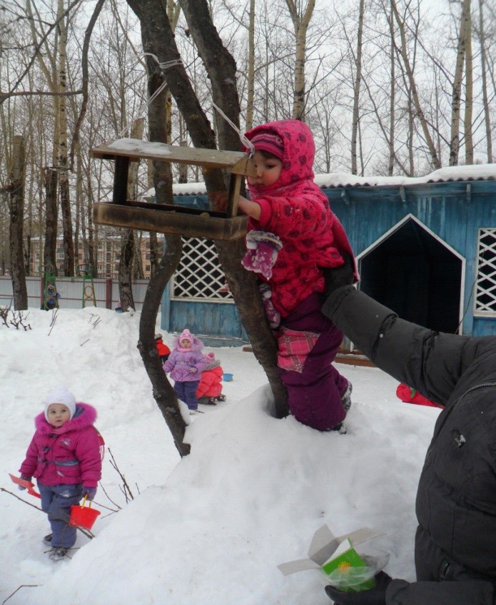 В холодную погоду, на кормушку прилетает больше пернатых птиц, постоянно подкармливая зимующих птиц, мы, таким образом, помогаем им пережить холодный период года, когда птицам сложно добывать корм из-под снега. Кормя птиц зимой, мы сохраняем их численность, не давая им замёрзнуть. В течение нескольких лет мы с детьми прикармливаем птиц во время прогулок и птицы нас уже не бояться. Они прилетают к кормушке подолгу сидят там и клюют зёрнышки, крупу. Так же в своей работе с детьми для более лёгкого запоминания названия птиц, мы используем художественное слово, различные дидактические и подвижные игры.
