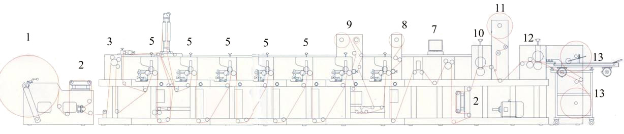 1- узел размотки; 2- автоматическое равнение края полотна; 3- автоматическое поддержание натяжения на размотке/намотке; 4- блок управления натяжением; 5- печатные секции; 6- разгрузки напряжения; 7- видеоконтроль качества печати; 8- отделочная секция; 9- секция холодного (УФ) тиснения; 10- секция высечки/надсечки; 11- вал намотки облоя; 12- секция продольной резки; 13- узел намотки готовой продукции.