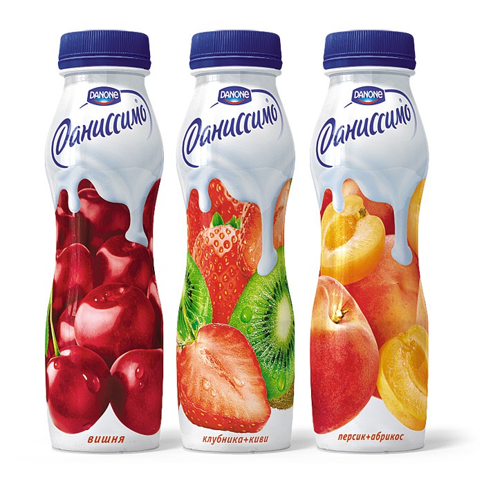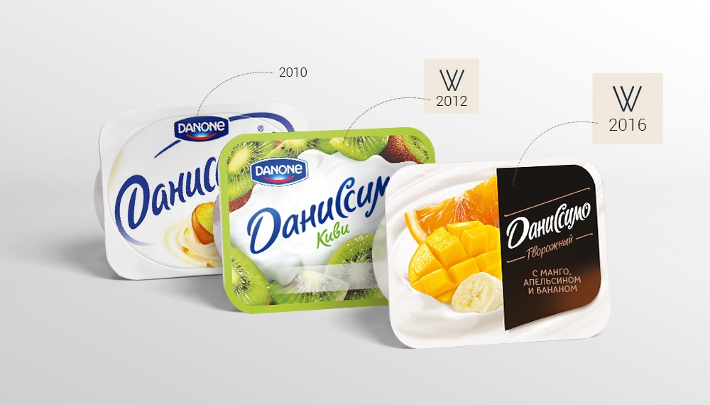 Бренд «Даниссимо» всегда славился своим оригинальным дизайном. Сначала были часы – простой и эффективный символ. Использовалась упаковка ПЭТ-бутылка с винтовой крышкой из ПЭНД. Для упаковки ПЭТ-бутылки характерна вместимость 330 граммов. Потом был лаконичный белый дизайн, демонстрировавший статус продукта и выделявший его на полке. Использовалась упаковка пластиковые стаканчики вместимостью 105 граммов с алюминивой фольгой в качестве верхней плёнки (плёнки крышки). Далее потребовались новые решения, которые привлекли бы внимание к главной ценности бренда и разработали новый дизайн упаковки.