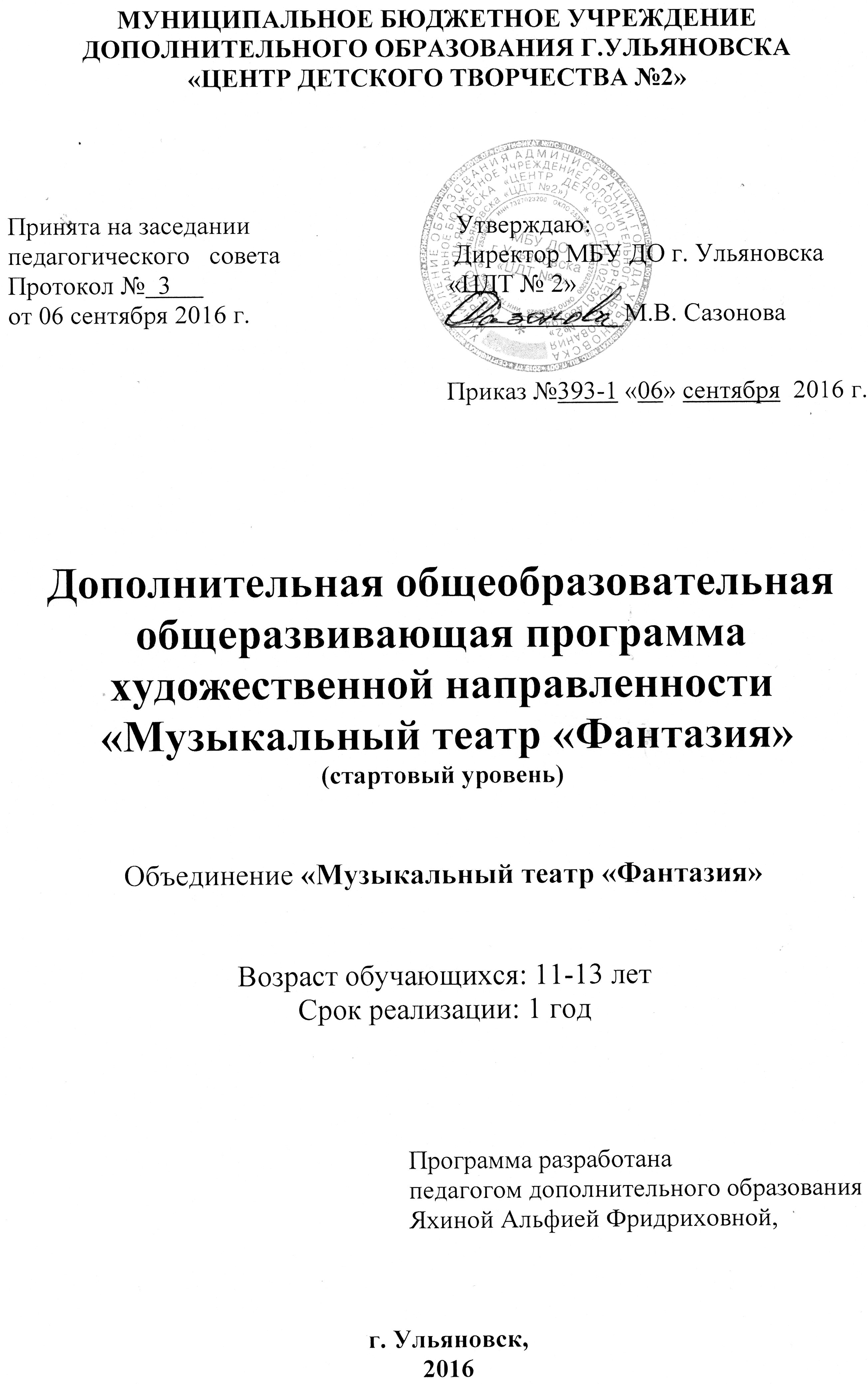 Дополнительная общеобразовательная общеразвивающая программа художественной направленности «Музыкальный театр «Фантазия» рассмотрена на заседании методического совета Протокол №1 от 01.01.2001 г.