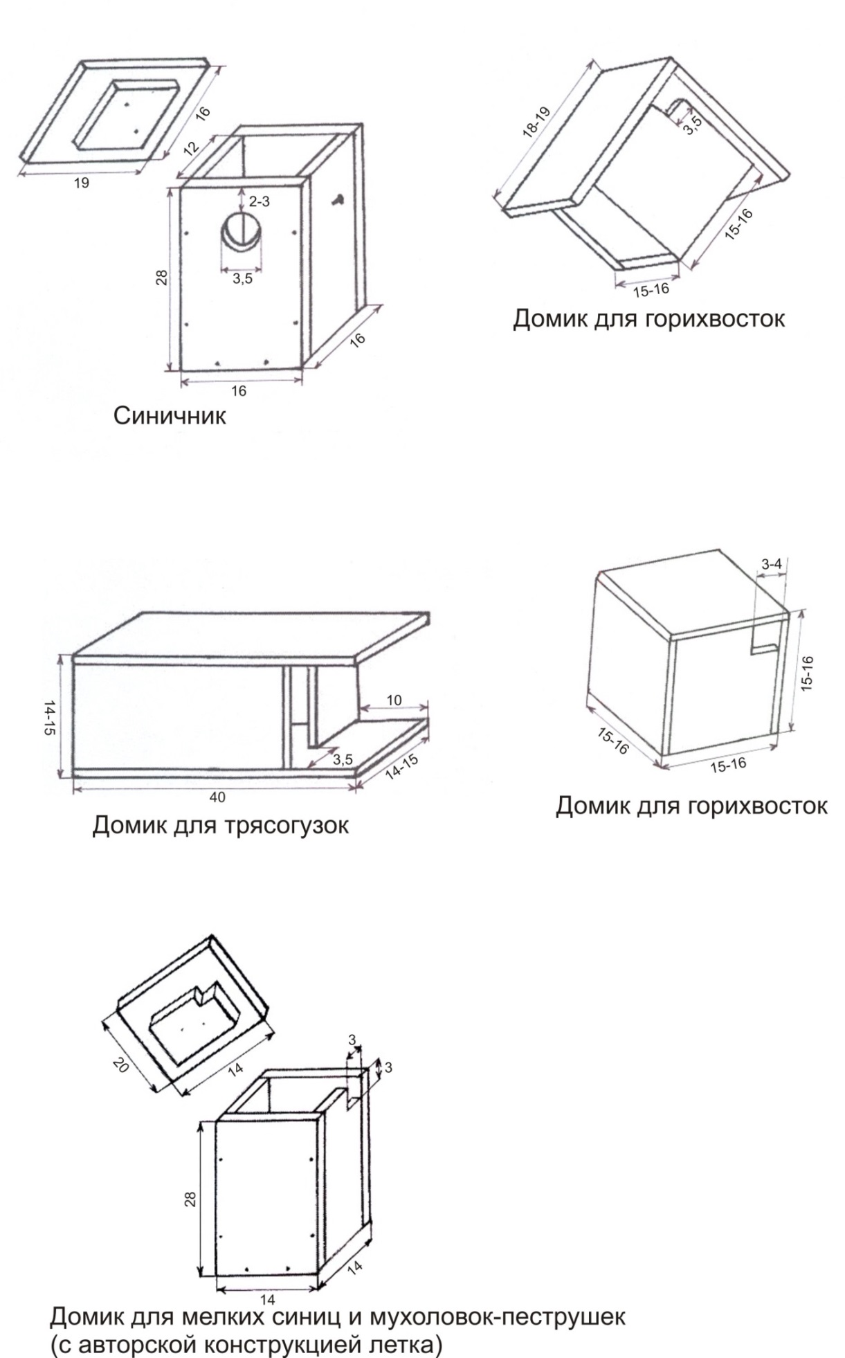 Домики для горихвосток имеют ромбовидную форму. Все стороны такого ромба имеют длину 16 см. В верхней части пропиливается квадратный леток. Одна из верхних боковых стенок крыши делается со съемной втулкой так же, как и у синичника, или горизонтальной планкой привинченной в нижней части внутри съемной половинки крышки. Крепиться она может также с помощью проволоки. Детали крыши могут иметь небольшие свесы по бокам, примерно по 2-3 см и выступать впереди домика на 1-2 см. Рекомендуют для горихвосток также домики в виде кубика, каждая сторона которого составляет 15-16 см. Крыша такого домика может иметь свес в 3 см. Леток, как правило, квадратный в одном из верхних углов передней стенки.