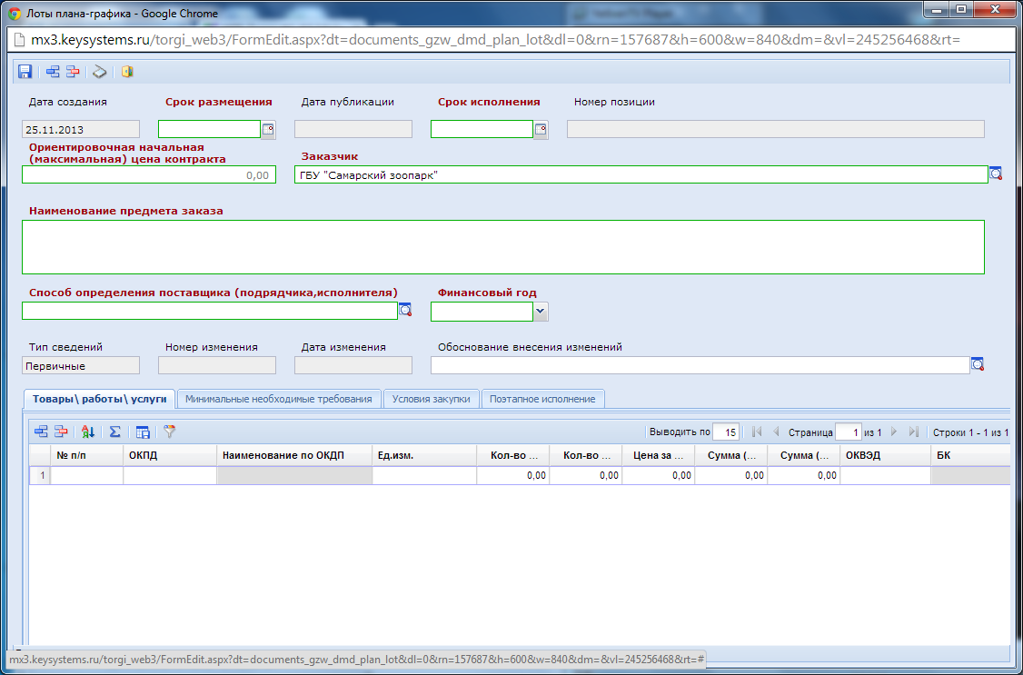 Как только документ «Лот плана-графика закупок» будет заполнен и успешно сохранен, он автоматически попадет в состав документа «План-график» Если лот заполняется первично, то будет создан новый документ «План-график».