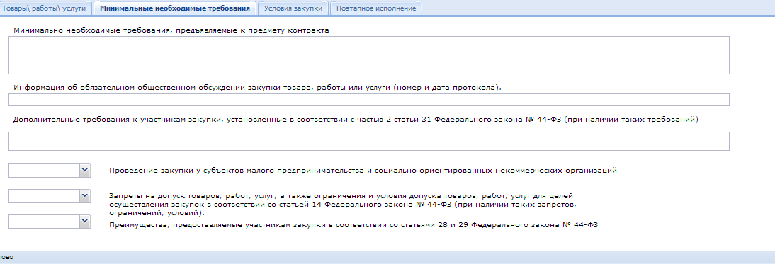 Во вкладке «Минимально необходимые требования». Вносится информация об установленных минимальных необходимых требованиях к предмету контракта, информация об обязательном общественном обсуждении закупок (номер и дата протокола вводятся вручную), указываются дополнительные требования к участникам закупки, указать преимущества, запреты на допуск товаров, работ, услуг (Рисунок 22).