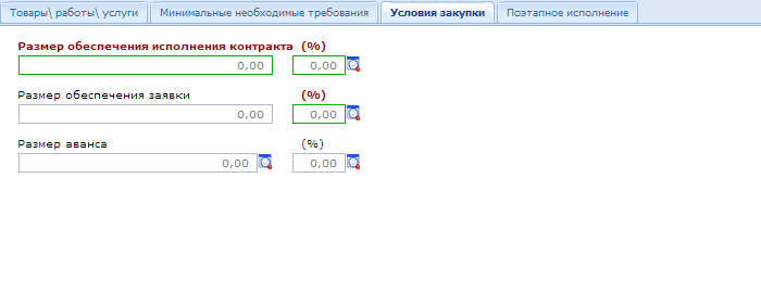 Вкладка «Условия закупки» отражает информацию об установленных размерах обеспечения исполнения контракта, обеспечения заявки и размера аванса (Рисунок 23).