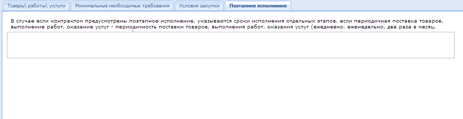 Вкладка «Поэтапное исполнение» заполняется в случае, если контрактом предусмотрено поэтапное исполнение, указываются сроки отдельных этапов, если это периодичная поставка товаров, выполнения работ, оказания услуг (Рисунок 24).
