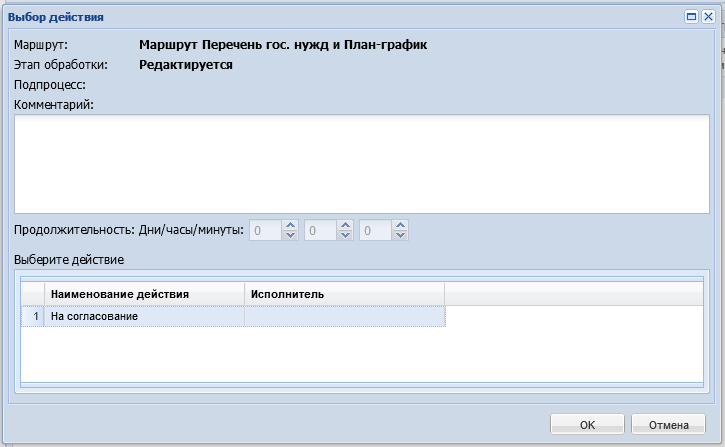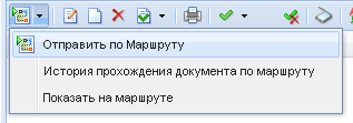 Для отправки документа на Маршрут текущей модели бизнес - процесса, требуется выделить документ и нажать кнопку [Отправить по маршруту] (Рисунок 29), при этом необходимо указать действие, которое необходимо совершить (например, отправить документ на доработку или перевести на след этап согласования») и нажать на кнопку [ОК] (Рисунок 30).