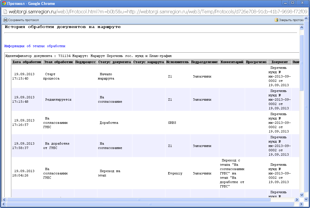 Для просмотра смены состояния и информации о прошедших и текущих этапах обработки документа следует выделить документ и нажать на кнопку [История прохождения документа по маршруту]. При этом откроется протокол, содержащий следующие сведения (Рисунок 31):