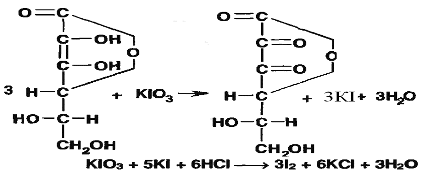 ~Количественное содержание кислоты аскорбиновой проводят в соответствии с приведенной ниже химической реакцией методом … .