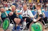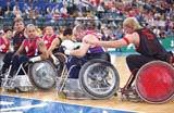 Регби на колясках. Регби на колясках объединяет элементы баскетбола, футбола и хоккея с шайбой, и играется на баскетбольной площадке. Команды состоят из 4 игроков, плюс допускается количество запасных вплоть до восьми человек. Классификация игроков основывается на их физических возможностях, исходя из которых, каждому присваивается определенное количество баллов от 0.5 до 3.5. Суммарное количество баллов в команде не должно превышать 8.0. В игре используется волейбольный мяч, который можно нести, передавать руками. Игра состоит из четырех периодов, длительностью по 8 минут. |