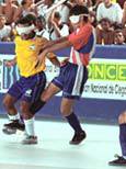 | Голбол. Цель соревнования состоит в том, чтобы катить шар в цель противника, в то время как противостоящие игроки пробуют блокировать шар своим телом. Goalball играется мужскими и женскими атлетами со слабым зрением которые носят маски "затмения", чтобы гарантировать, что все участники конкурируют одинаково. Каждая команда имеет трех игроков. Это - исключительно спорт для атлетов с визуальным ухудшением и был введен в паралимпийские игры в1976 в в Торонто. Все изнашивание конкурентов таращит глаза, в то время как они находятся на суде игры, который позволяет атлетам с различными степенями видения участвовать вместе. В настоящее время игра культивируется приблизительно в 51 стране мира. |