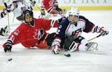 | Хоккей с шайбой. Как и в традиционном хоккее с шайбой, шесть игроков (включая голкипера) от каждой команды находятся на поле единовременно. Сани оборудованы лезвиями коньков, и игроки перемежаются по полю, используя палки с железными наконечниками. Игра состоит из трех периодов, длительностью 15 минут. |