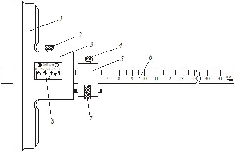 Выпускаются штангенглубиномеры с ценой деления нониуса 0,05 мм и пределами измерений 0 – 160, 0 – 200, 0 – 250, 0 – 315, 0 – 400 мм. По конструкции штангенглубиномер отличается от штангенциркуля отсутствием неподвижных губок на штанге и наличием вместо них основания 1, которое является опорой при измерении глубины. Нулевой размер штангенглубиномер показывает при совмещении торца штанги (линейки) 6 и основания 1.