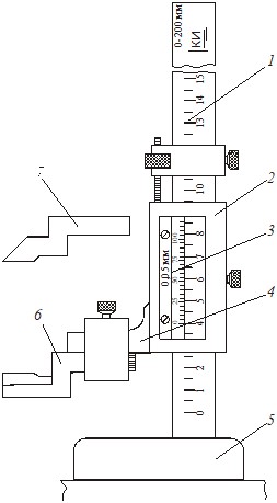 Штангенрейсмас применяют для разметки, но он может быть использован и для измерения высоты деталей, установленных на плите (рис.3). Штангенрейсмасы имеют цену деления нониуса 0,1 и 0,05 мм и предел измерений до 2500 мм. Они имеют массивное основание 5 для установки на плите. Перпендикулярно основанию расположена штанга 1 с миллиметровой шкалой. Подвижная рамка 2 с нониусом 3 имеет державку 4 для установки специальной измерительной ножки 6 для измерения высоты или разметочной ножки 7.