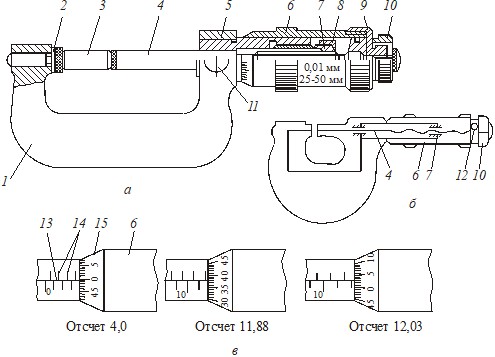 При снятии отсчета пользуются шкалами на стебле и барабане. Срез барабана является указателем продольной шкалы и регистрирует показания с точностью 0,5 мм. К этим показаниям прибавляют отсчет по шкале барабана (рис.1,в).