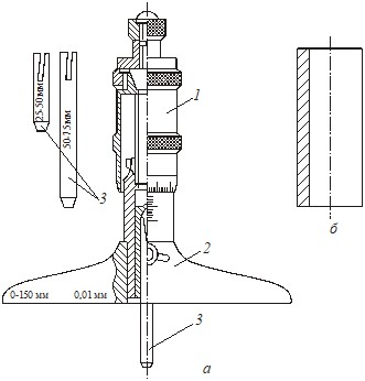 Микрометрический глубиномер (рис.2,а) состоит из микрометрической головки 1, запрессованной в отверстие основания 2. Торец микровинта этой головки имеет отверстие, куда вставляют разрезными пружинящими концами сменные стержни 3 со сферической измерительной поверхностью. Сменные стержни имеют четыре размера: 25; 50; 75 и 100 мм. Размеры между торцами стержней выдержаны очень точно. Измерительными поверхностями в этих приборах являются наружный конец сменного стержня 3 и нижняя опорная поверхность основания 2. При снятии отсчета необходимо помнить, что основная шкала, расположенная на стебле, имеет обратный отсчет (от 25 мм до 0).