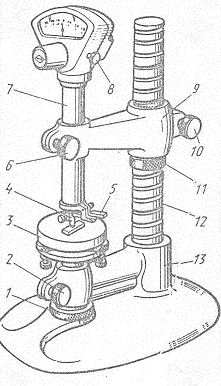 Кронштейн следует опускать плавно, не допуская удара наконечника о концевую меру! Нельзя трогать регулировочные винты 14 столика, так как это нарушит установку