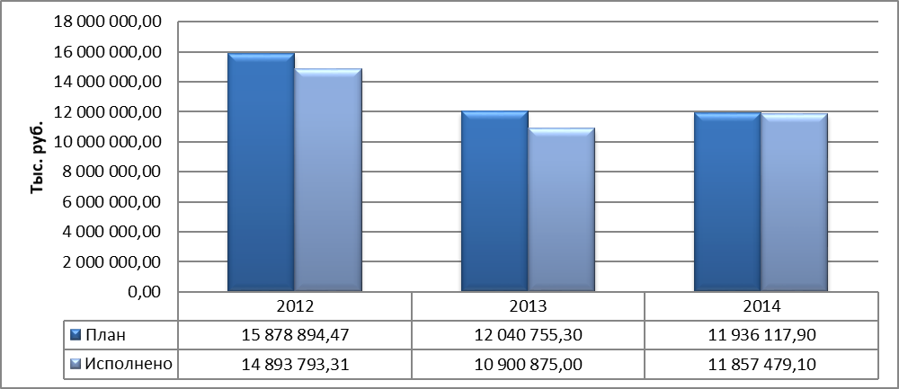При анализе исполнения бюджета г. Владивостока по расходам отмечается та же тенденция, что и при исполнении бюджета по доходам, а именно: фактическое значение расходов бюджета меньше, чем запланированные показатели. В 2012 году план по расходам не выполнен на 1874735,16 тыс. руб. или на 9,95%, в 2013 году – на 1195196,9 тыс. руб. или на 9,06%, в 2014 году – на 543116,9 тыс. руб. или на 4,27%.