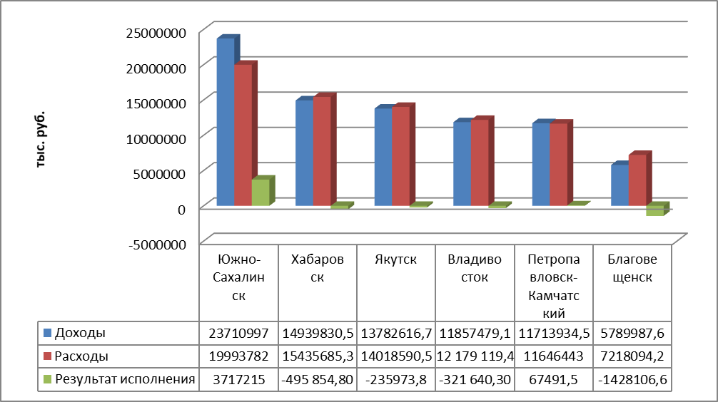 Анализ данных свидетельствует, что по показателям доходов и расходов бюджета г. Владивосток занимает средние позиции после бюджета г. Якутска. При этом показатели доходов и расходов г. Владивостока очень близки к аналогичным данным Петропавловск-Камчатского ГО. За исключением того, что бюджет г. Владивостока является дефицитным.