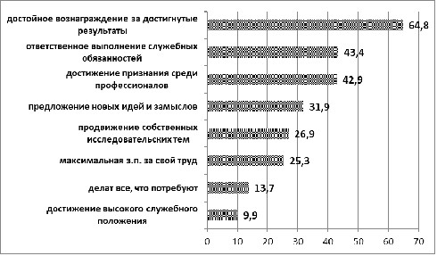 В своей научной деятельности женщины ориентированы, прежде всего, на получение достойного вознаграждения за достигнутые результаты (64,8%), что характерно для монетарного типа карьеры. На втором месте у женщин – ответственное выполнение служебных обязанностей (43,4%), что характеризует отсутствие карьерных устремлений. Такая ориентация как достижение призвания среди профессионалов характерна для 42,9% женщин, что говорит о наличии статусного устремления. Предложение новых идей и замыслов свойственно для трети женщин (31,9%), что подтверждает их квалификационную направленность.