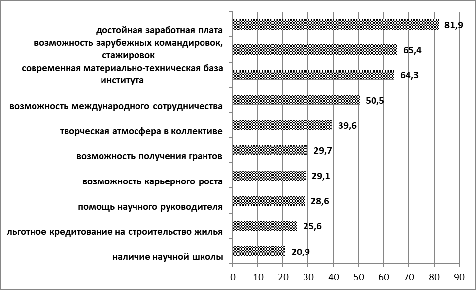 По мнению подавляющего большинства женщин (81,9%), для того, чтобы они могли строить свою научную карьеру, должна быть достойная заработная плата. Немаловажным условием является и возможность зарубежных стажировок и командировок, а также возможность международного сотрудничества. Очень важным условием является наличие современной материальна-технической базы института. Значение женщины придают и творческой атмосфере в коллективе. Практически треть женщин отметили такие условия как возможность получения грантов, возможность карьерного роста, помощь научного руководителя и льготное кредитование на строительство жилья. И только каждая пятая женщина выбрала наличие научной школы как одно из условий для построения ее научной карьеры.