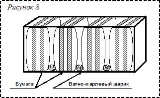 Правило 2 – Размещение стерилизуемых пакетов в загрузочных корзинах, сетчатых лотках и др. необходимо осуществлять, исключая факторы, оказывающие прямое влияние на эффективность стерилизации: возможность образования и скопления конденсата на /в/ пакетах, их увлажнение, и соблюдая порядок размещения загрузочных корзин в стерилизационной камере (см. рис. 7). Правило 3 – Свободный проход к упаковкам воздуха и пара обеспечивается соблюдением требования по укладке пакетов в корзине "на ребро", прокладкой между плёночными сторонами пакетов ватно-марлевых шариков (см. рис. 8).