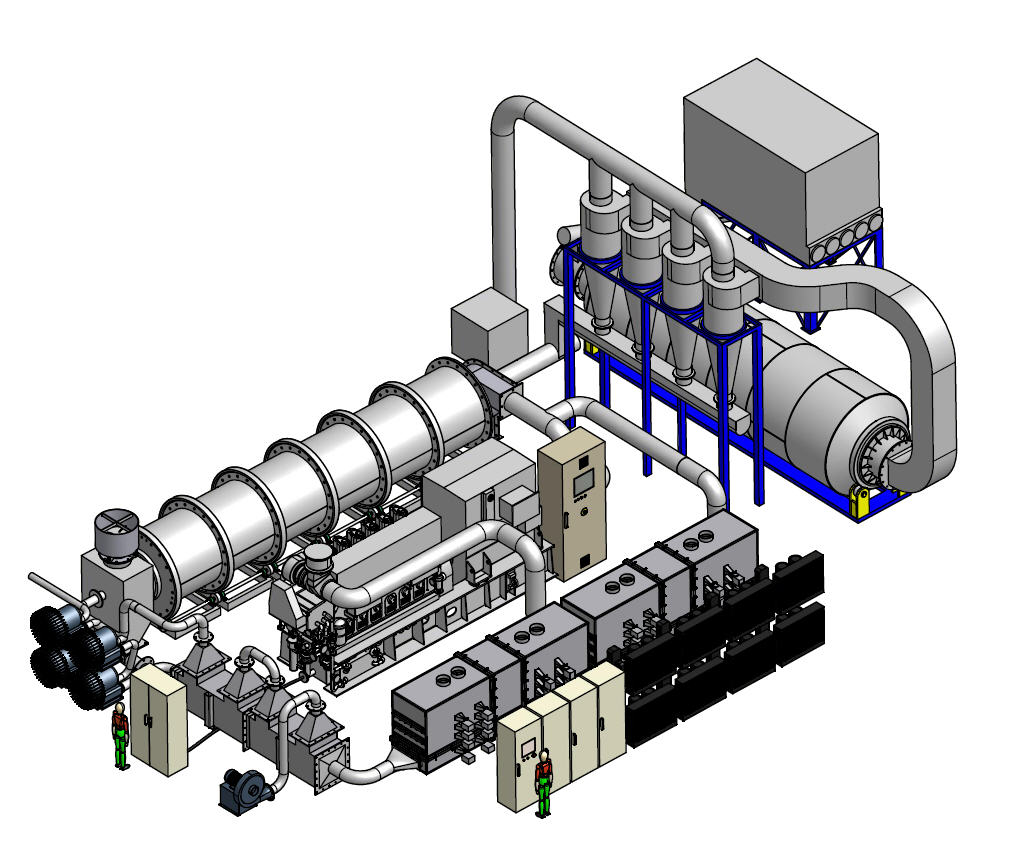 • установка будет состоять из 3 или 4 емкостей с различными видами отходов, дозатора с мешалкой для смешивания, с сушилкой (или двух) компании KLIMAPOL, реактора ATON HR 5000, реактор ATON MOS 3000, системы охлаждения удаляемых газов и двух генераторов электроэнергии TURBODEN 12 HRS.