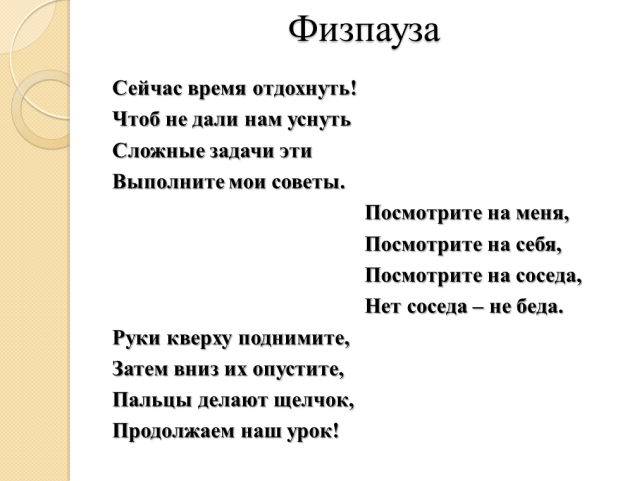 Затем вниз их опустите, Пальцы делают щелчок, Продолжаем наш урок. Слушают объяснения преподавателя. Распределяют роли главного бухгалтера и бухгалтеров. Главный бухгалтер распределяет виды деятельности между бухгалтерами. Каждый бухгалтер выполняет порученную ему работу, результаты которой вносятся в бланк бухгалтерского баланса. Главный бухгалтер координирует работу своего отдела. Проверяют правильность заполнения бухгалтерского баланса по эталонам ответов, проставляют результаты в карты самооценки. Главный бухгалтер представляет итог работы с оценкой деятельности каждого бухгалтера. | Слайд № 6 Вопросы бухгалтерского биатлона (Приложение 3) Слайд № 7 Карта самооценки Слайд № 8 Слайд № 9 Задание для составления бухгалтерского баланса (Приложение 4), инструкция для главного бухгалтера (Приложение 5), бланки бухгалтерского баланса, схемы классификации хозяйственных средств предприятия и источников их формирования, инструкция построчного заполнения бухгалтерского баланса,План счетов, калькуляторы. Эталоны ответов (Приложение 6). Карты самооценки Заполненные бланки бухгалтерских балансов, карты самооценки | 10′ 1′ 3′ 15′ 2′ 3′ |