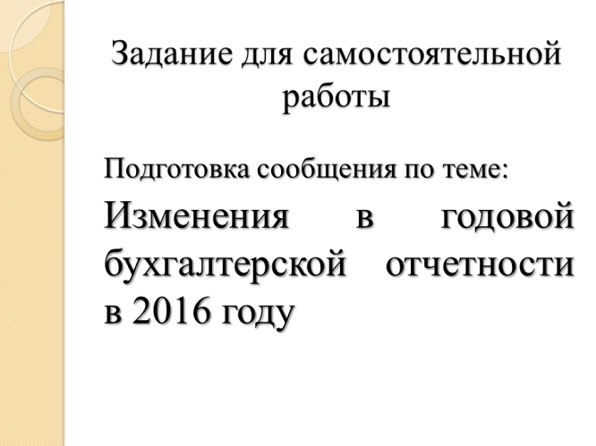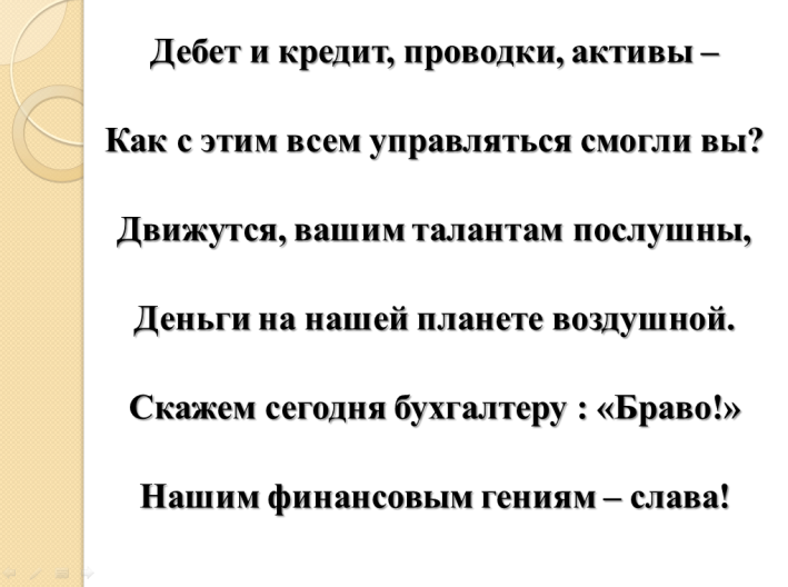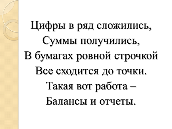 III. Оценочно – рефлексивный | 1) Подведение итогов урока Предлагает обучающимся подсчитать количество баллов в картах самооценки и подводит итоги урока. 2) Задание для самостоятельной работы Предлагает обучающимся записать задание для самостоятельной работы: Подготовка письменного сообщения по теме «Изменения в годовой бухгалтерской отчетности в 2016г.» 3) Рефлексия Предлагает вернуться к карточкам с ассоциациями к словосочетанию «бухгалтерский баланс» и скорректировать первоначальные ассоциации на основании результатов проделанной работы на уроке. Просит обучающихся подвести итог - достигнуты ли цели урока. Предоставляет слово обучающимся. Заданием для самостоятельной работы на сегодняшний урок было составить историческую справку о дне бухгалтера и подобрать стихотворение. Благодарит обучающихся за работу на уроке. | Подсчитывают баллы в карте самооценки, называют оценки Записывают задание для самостоятельной работы Корректируют ассоциации, вычеркивают ошибочно внесенные, дополняют новыми. Подводят итог Обучающийся зачитывает историческую справку о дне бухгалтера: 10 ноября праздновался Международный день бухгалтера, а в России день бухгалтера отмечается 21 ноября (в этот день в 1996 году был принят закон «О бухгалтерском учете»). Обучающийся читает стих: Дебет и кредит, проводки, активы – | Карты самооценки Слайд № 10 Карточки с ассоциациями Слайд № 11 | 1′ 1′ 2′ 1′ |